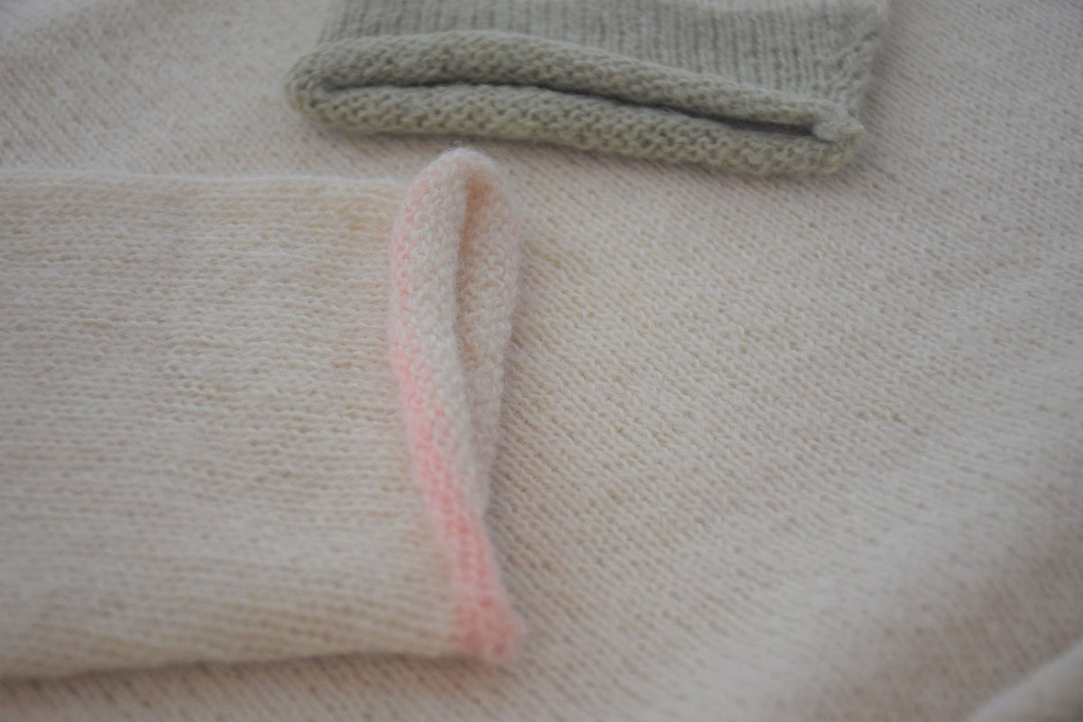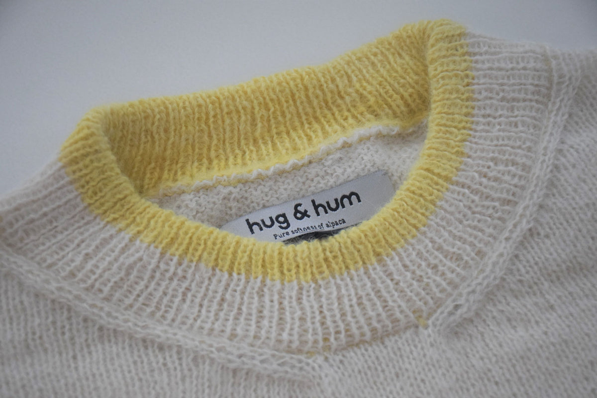 Amalia is a fine and cosy crew neck  sweater in 100% baby alpaca. It has a hip length and  rolled edges at the hem and cuffs. Little detail : the cuffs and crewneck have an extra stripe of colour. Model is 170 cm and is wearing  M. True to size.