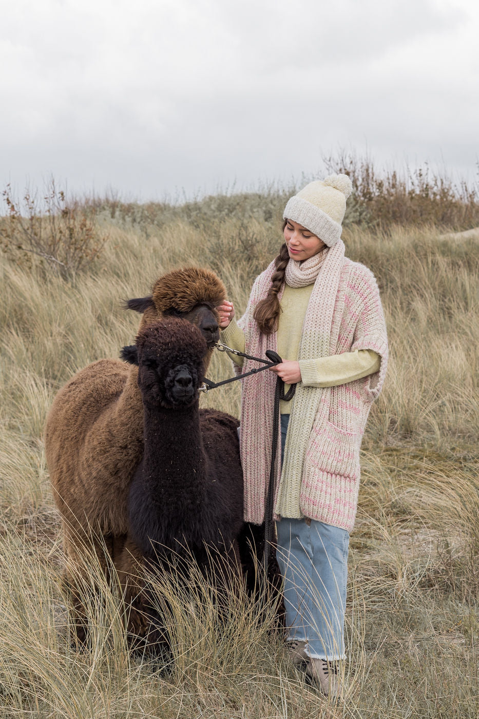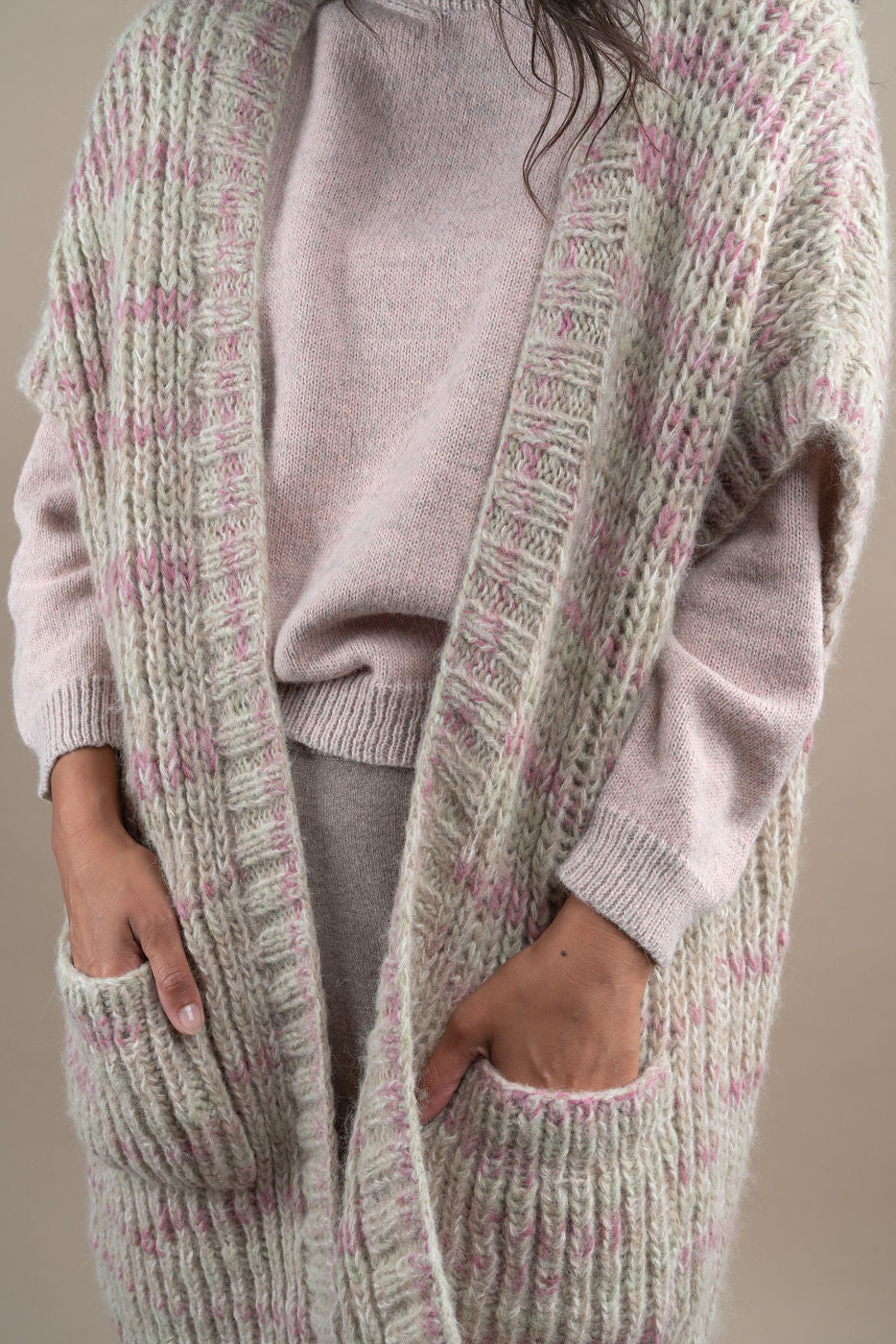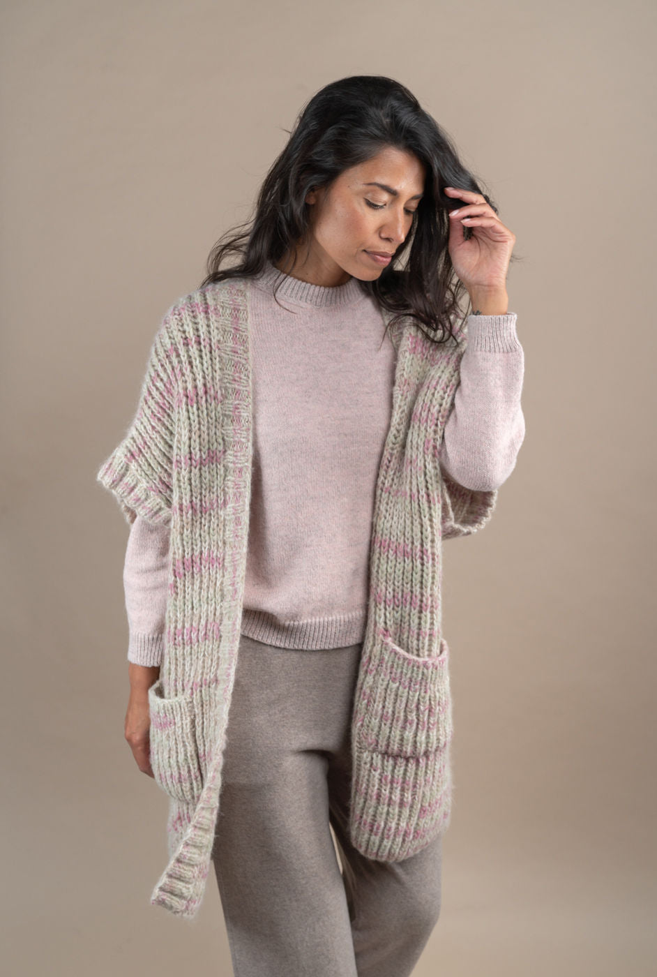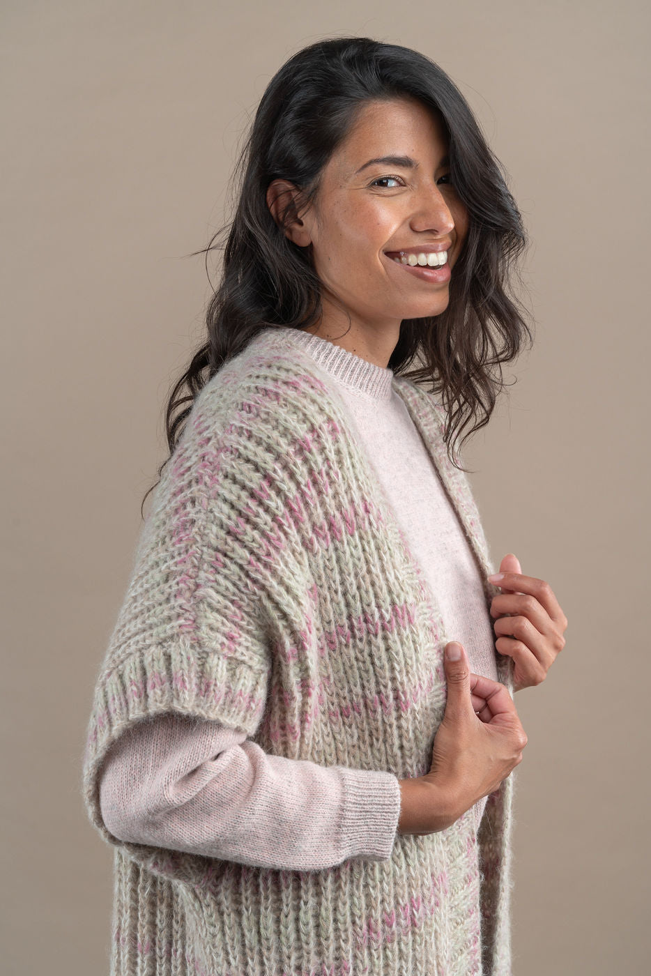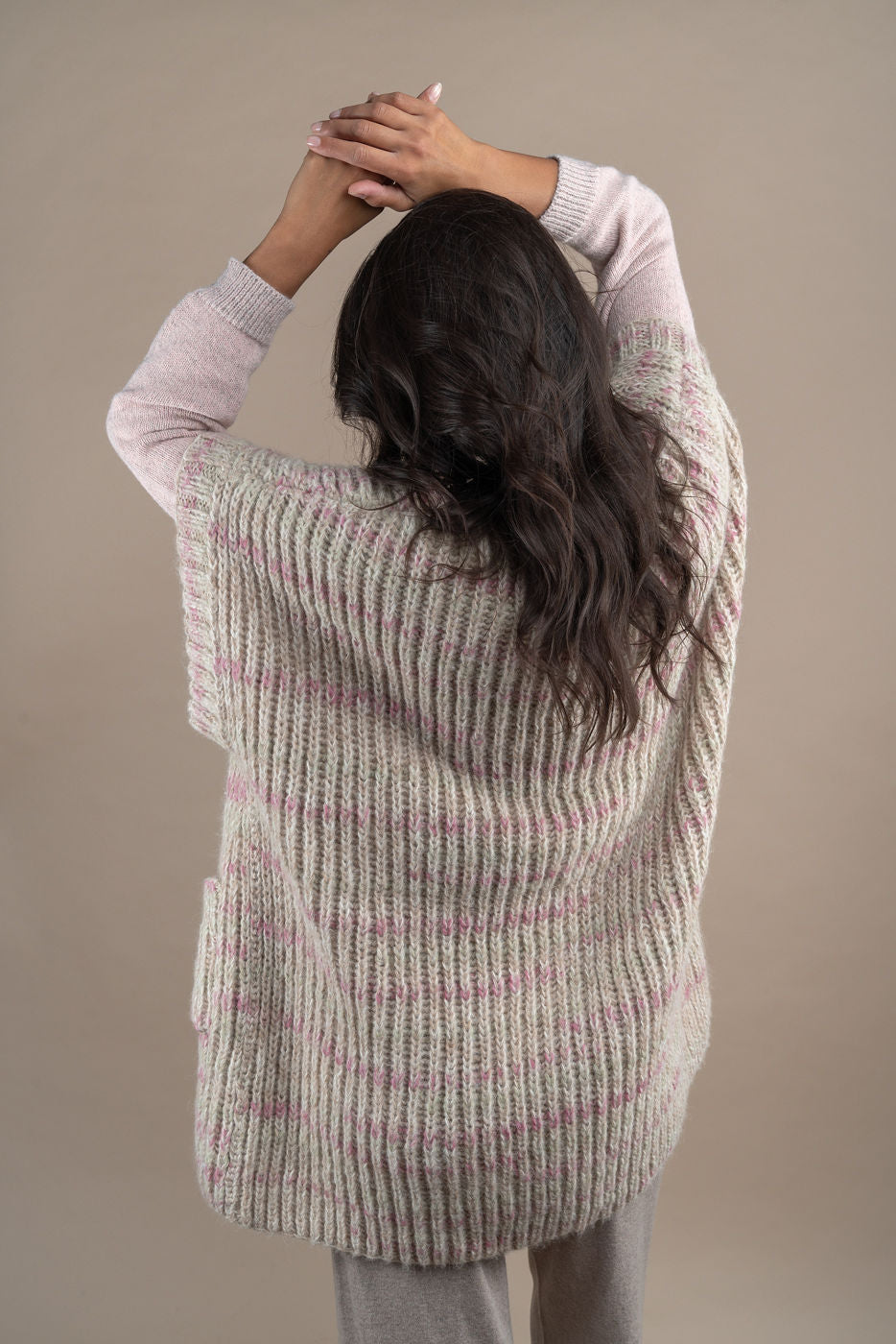 With this elegant,  sleeveless 100% baby alpaca cardigan, you will look forward to colder days. It feels  warm and cosy, yet light and stylish. Handknitted. Model is 178 cm. One size.
