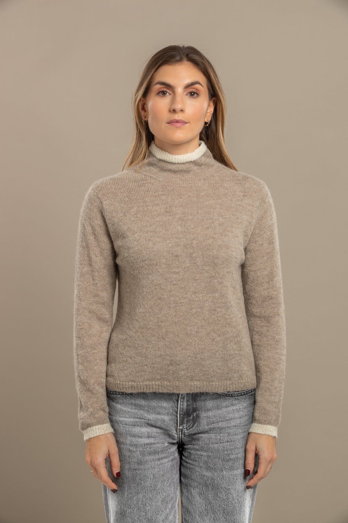 Dune is a very light  high neck sweater. The hem at the neck and the rib at the sleeves is in a contrasting colour. 100% baby alpaca. Handmade. Model is 170 cm and is wearing size S. True to size.