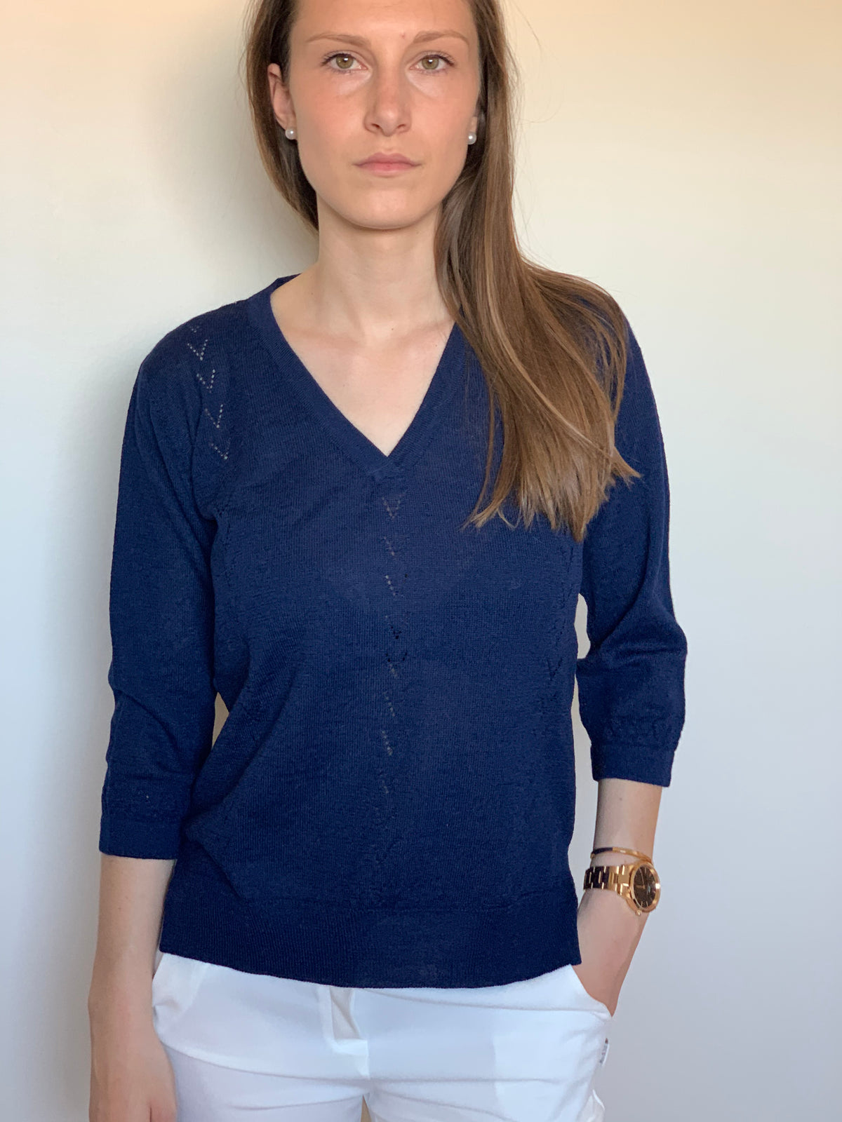 This knitted top is made in a luxurious extra fine 100% baby alpaca. It has a light weight and regular fit with a hip length and two slits on the sides. The sleeves have a 3/4 length. The front, back and sleeves have  nice v-detail stripes. Does not itch, can be worn on your bare skin. Model is 172 cm and is wearing an S.