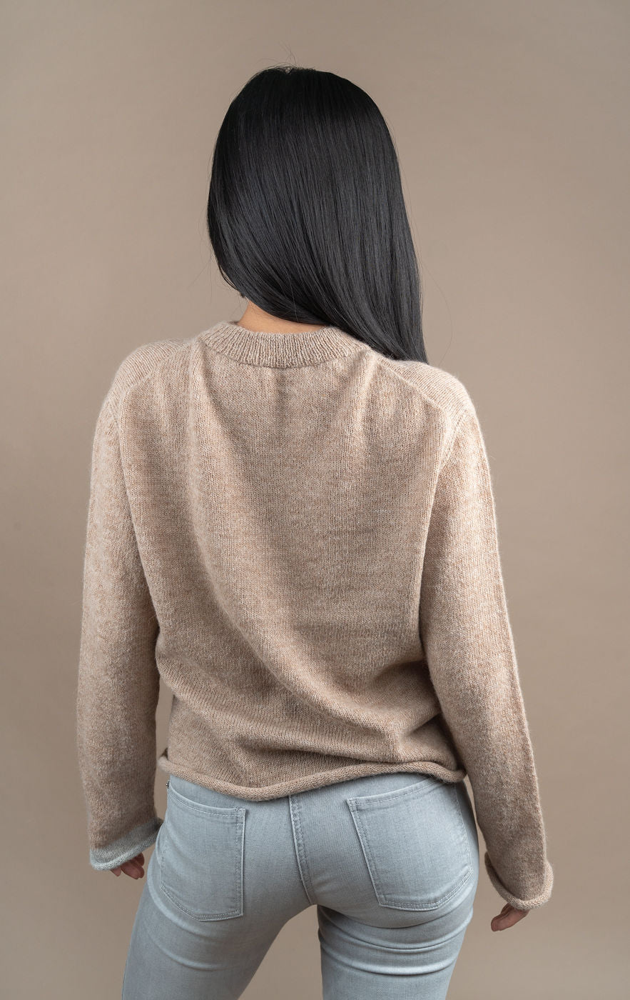 Amalia is a fine and cosy crew neck sweater in 100% baby alpaca. It has a hip length and rolled edges at the hem and cuffs. Little detail : the left cuff is in a matching color.