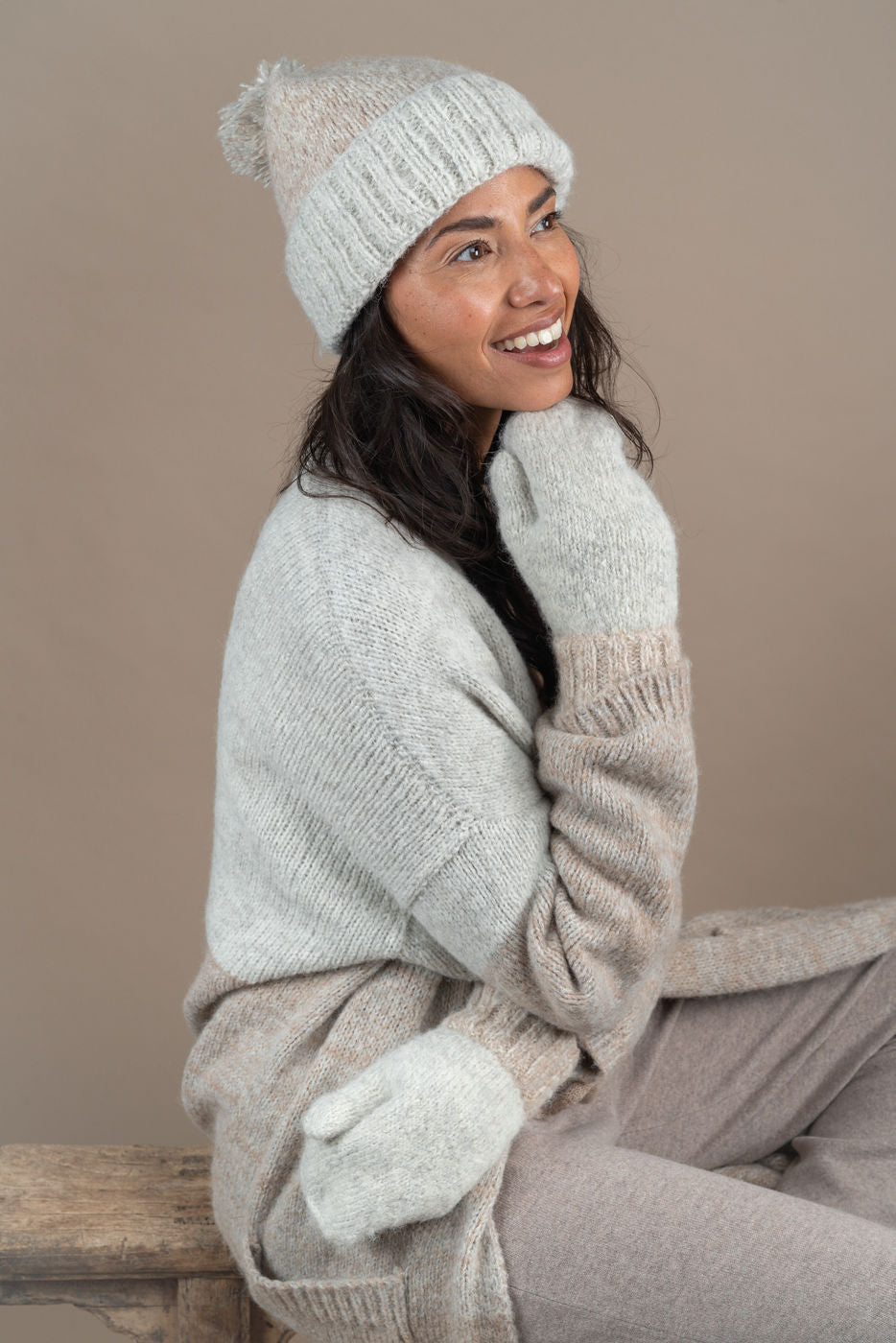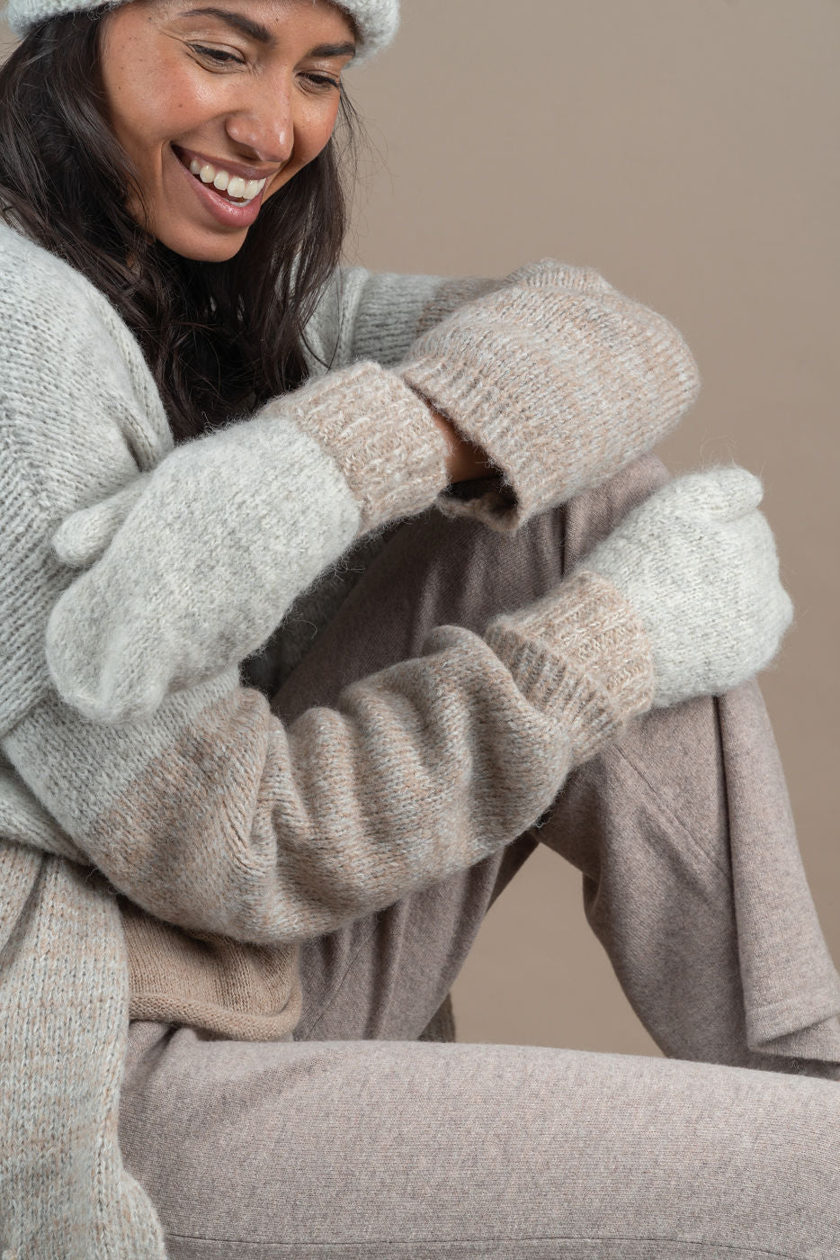 Deze wanten kunnen niet gemist worden tijdens een kille herfst of winter wandeling of een fietstocht. Dit duo is windproof dankzij een zeer fijne, zachte fleece binnenin. Baby alpaca. Met de hand gebreid. One size.